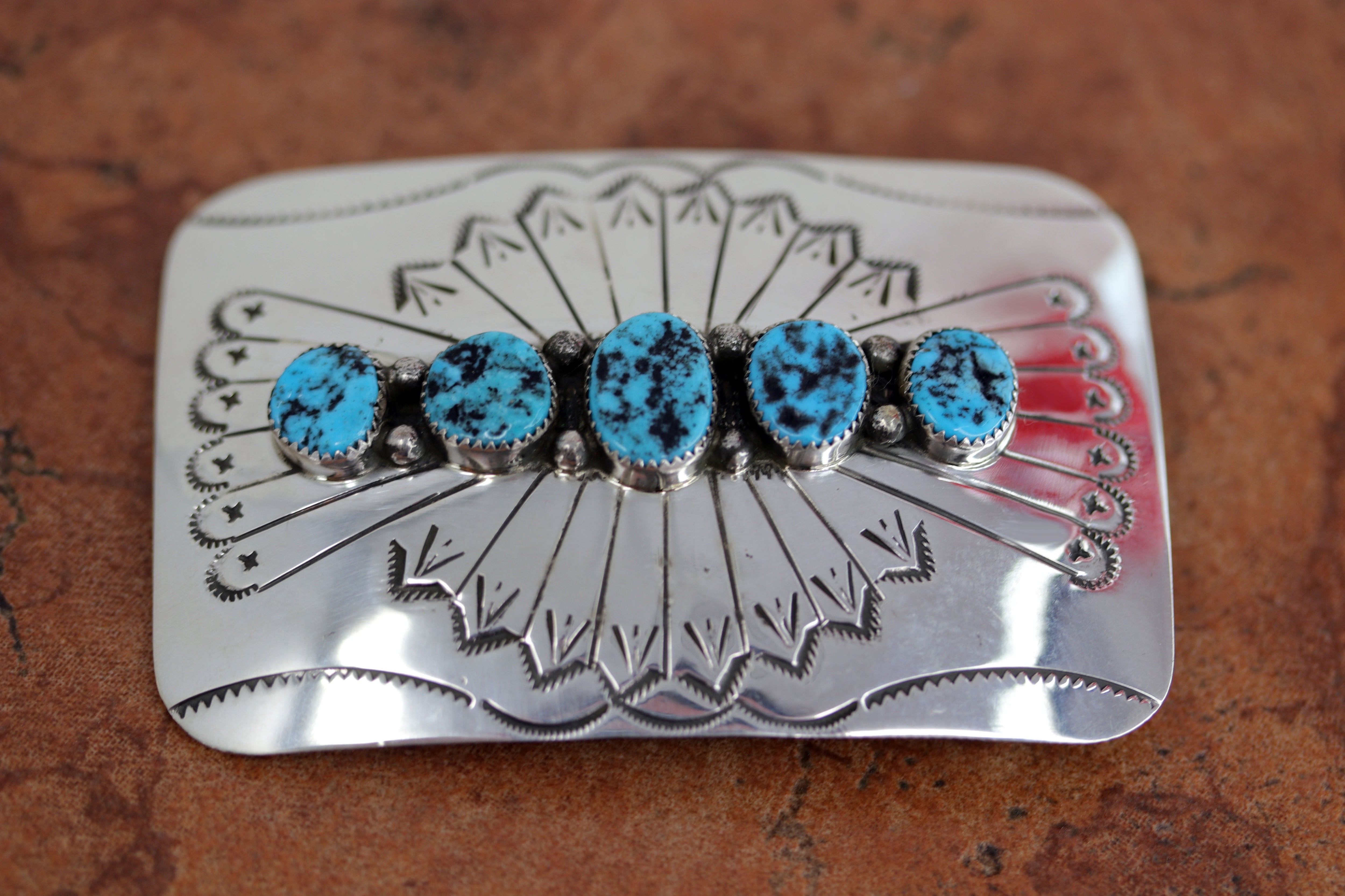 Authentic, Navajo Native American Belt Buckle. It is made from sterling silver and turquoise. It is stamped Sterling. It is 3" by 2 1/4". It will hold a belt up to 1 1/2" wide.