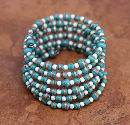 The bracelet is made from clay beads. The bracelet is stretchable and fits most sizes, it is 48" in total length if unrolled. The width of beads varies from 1/8" to 1/4". This item is not Native American.