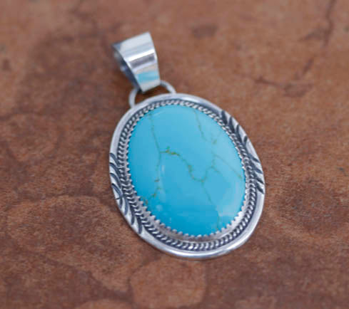 It is made from sterling silver and man made turquoise. The pendant is about 1 3/4" in length and 1" in width.