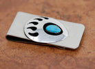 A brand new, very nice, authentic Native American money clip by M. Thomas. It is made from sterling silver and turquoise. The lower part of the money clip is made from nickel to give it more durability. It is about 1 3/4" in length and 1" wide.