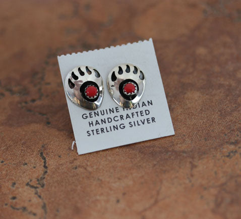 A beautiful Navajo Native American Bear Paw earrings. They are made from sterling silver and coral. The earrings are about 1/2" in length and 3/8" wide.