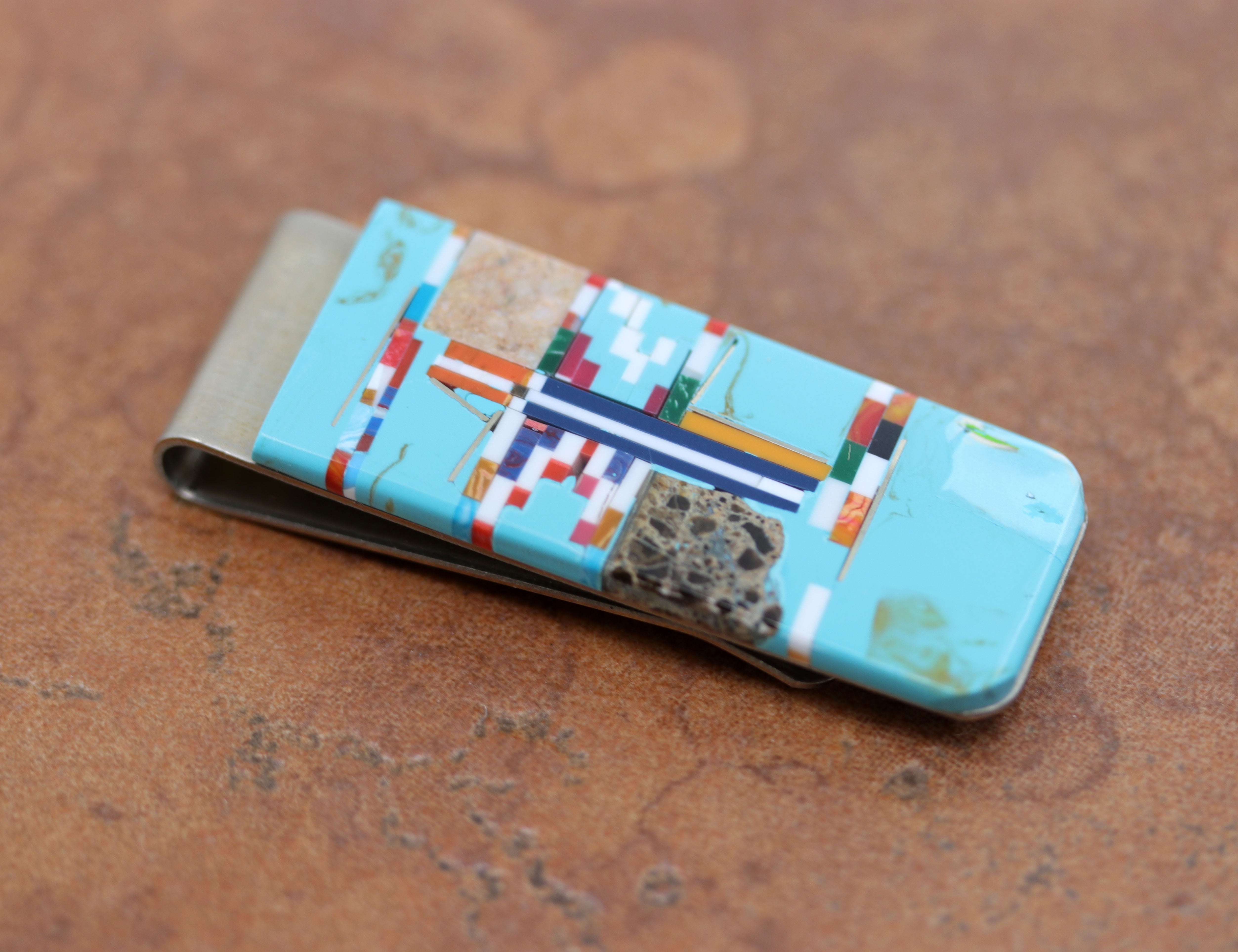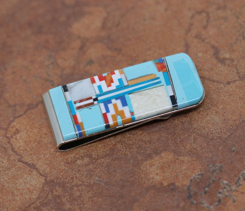 It is made from sterling silver. The lower part of the money clip is made from nickel to give it more durability. It is about 2" in length and 1" wide. This item is not Native American.