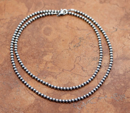 A beautiful sterling silver Desert Pearl necklace. The necklace is 30" in length and the beads measure 4 mm. This item is not Native American.
