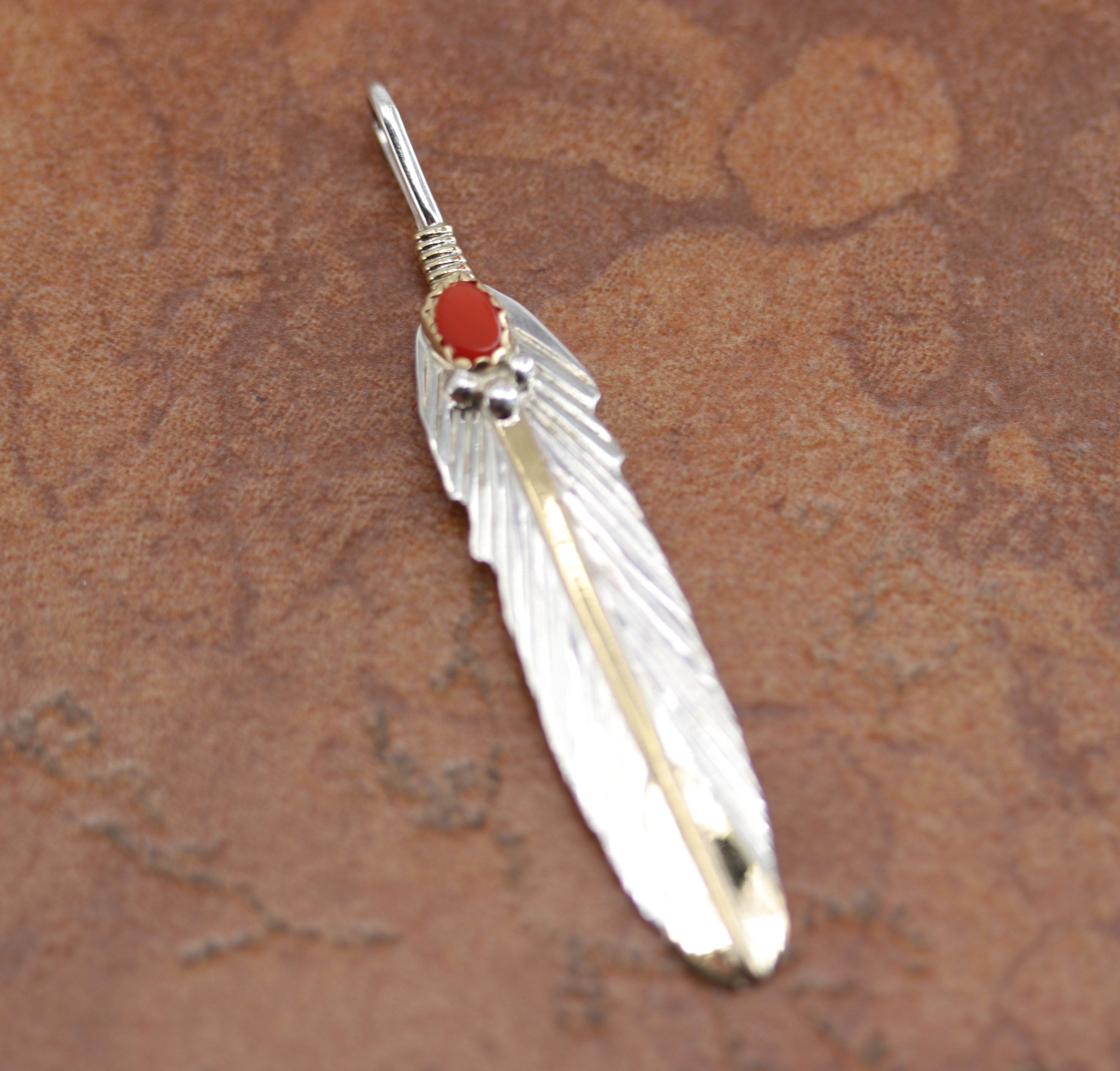 Beautiful Navajo Native American Feather Pendant. It is made from sterling silver and coral. It is 2 1/4" long and about 1/2" wide.