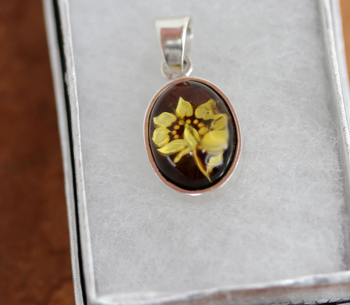 A beautiful hand carved pendant. It is made from sterling silver and genuine Baltic Sea Amber. The pendant is 1 1/4" in length including the hook, and 5/8" in width. This item is not Native American