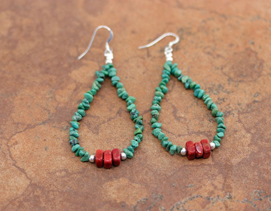 Beautiful Navajo Nugget Earrings. They are made from sterling silver, coral, and turquoise nuggets. The earrings about 2 3/4" long including the hook and the nuggets are 1/2" wide.