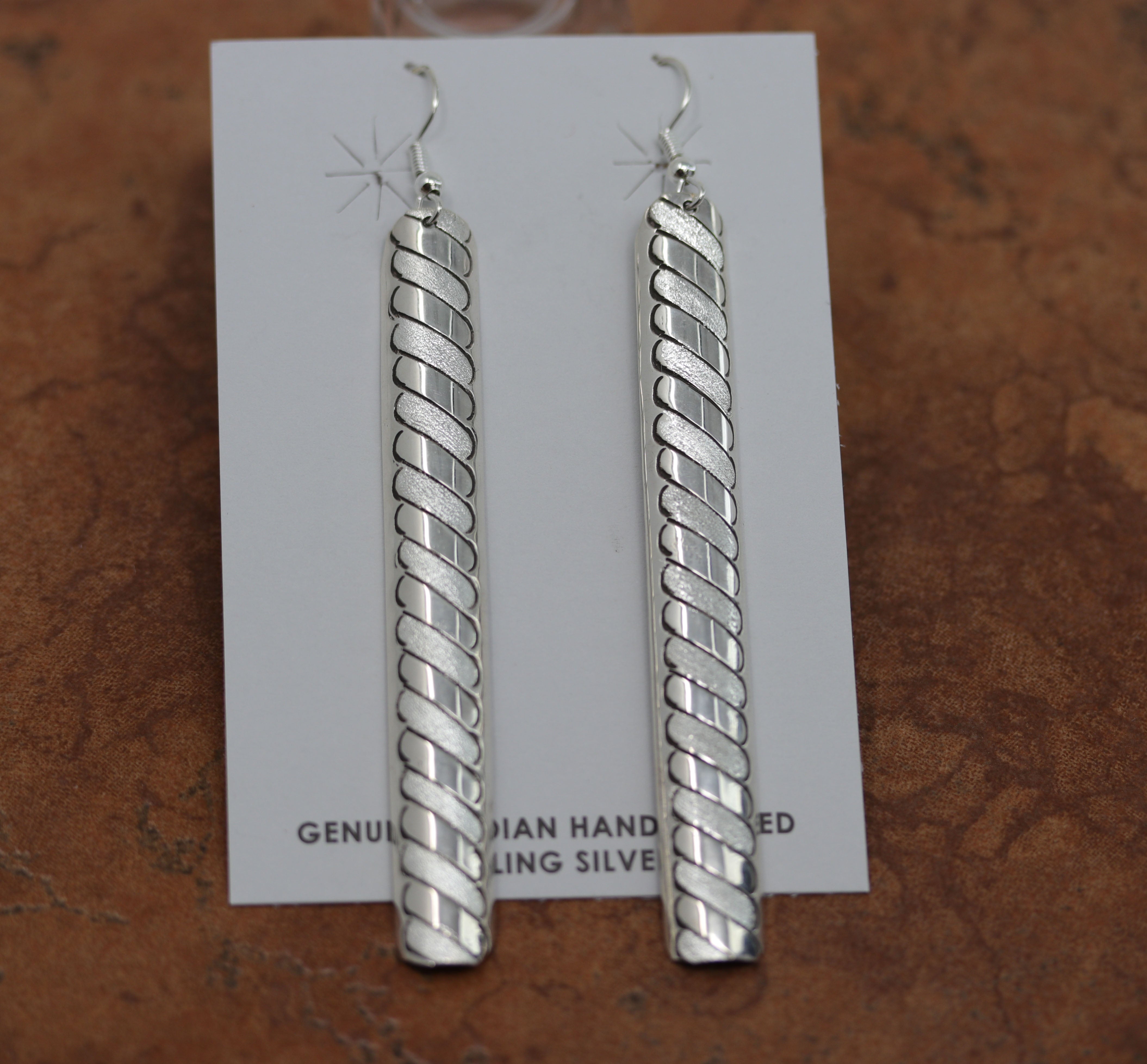 Beautiful Navajo Native American Earrings. They are made from sterling silver. The earrings about 3 3/4" long including the hook and 1/2" wide.