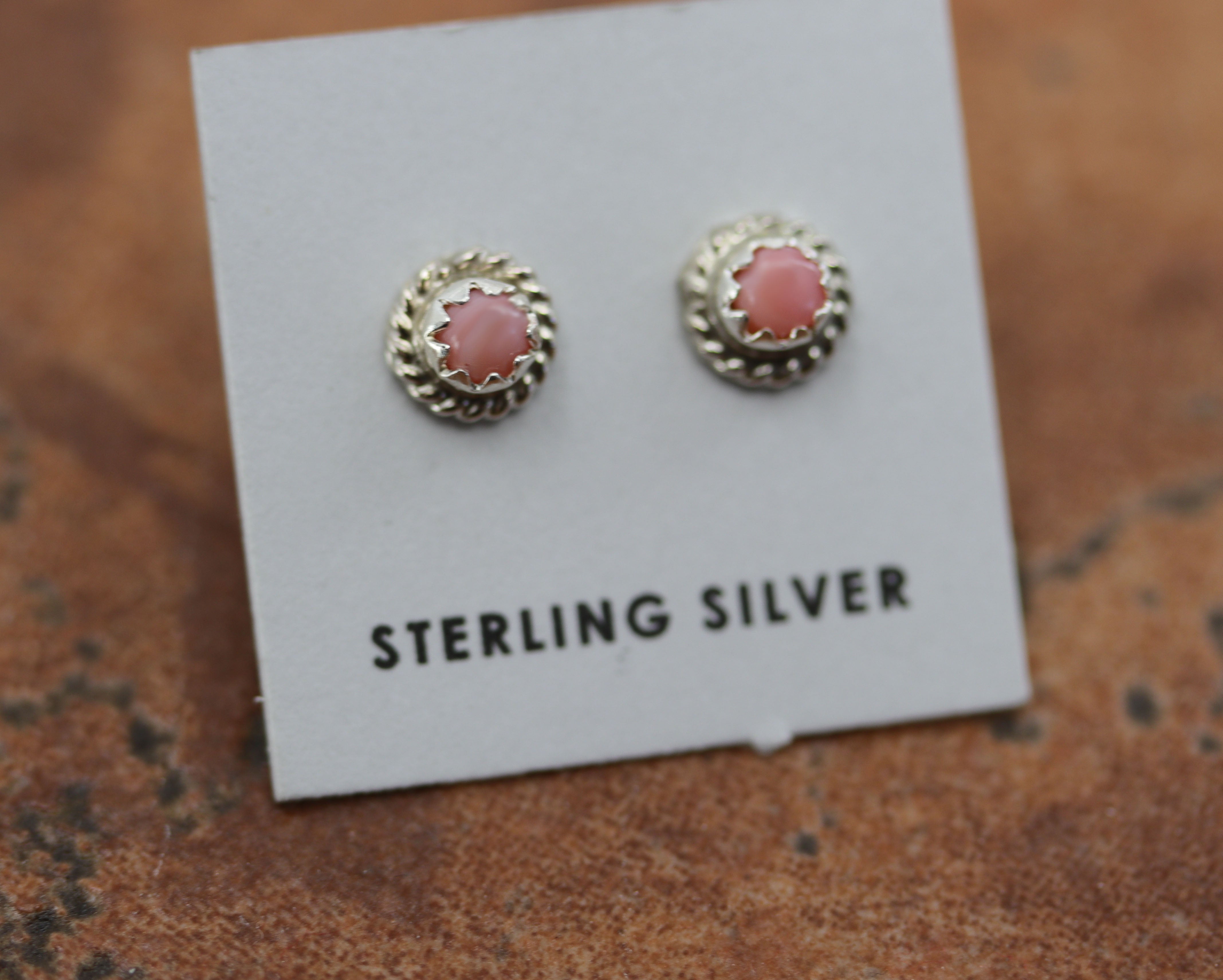 Beautiful Navajo earrings. They are made from sterling silver and pink quartz. The earrings are 1/4" in diameter.