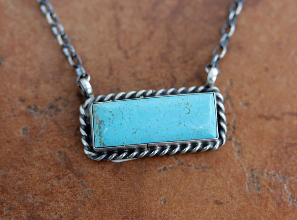 A beautiful Navajo Native American necklace. It is made from sterling silver, and turquoise. The necklace is about 17" in length. The center pendant measures 7/8" by 1 3/8".