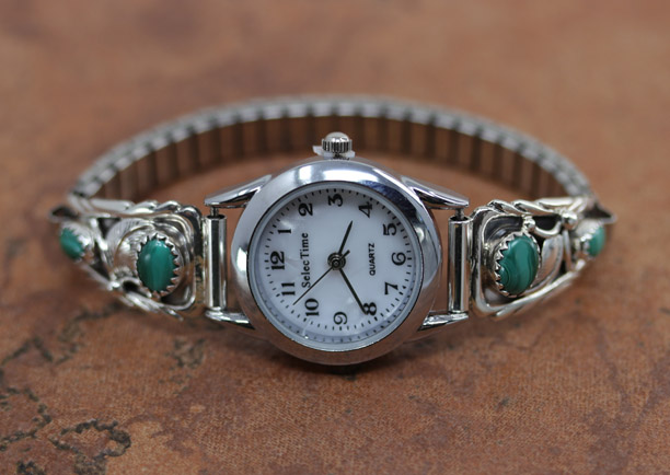 A very nice, authentic, Navajo Native American watch. It is made from sterling silver and malachite. The Navajo designs are about 1 1/8" in length, and the watch itself is 1" in diameter. The Navajo design is stamped sterling. The whole watch including the wristband can fit anywhere for a 6"-8" wrist. The actual watch is stamped stainless steel back and Japan MOVT.